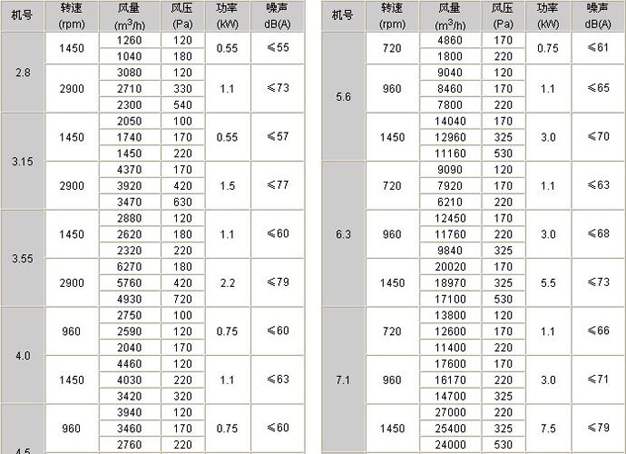 一、规格型式多,应用范围广;可根据使用场合及风量、压力和噪声的不同要求,选用以下三种型式的风机。