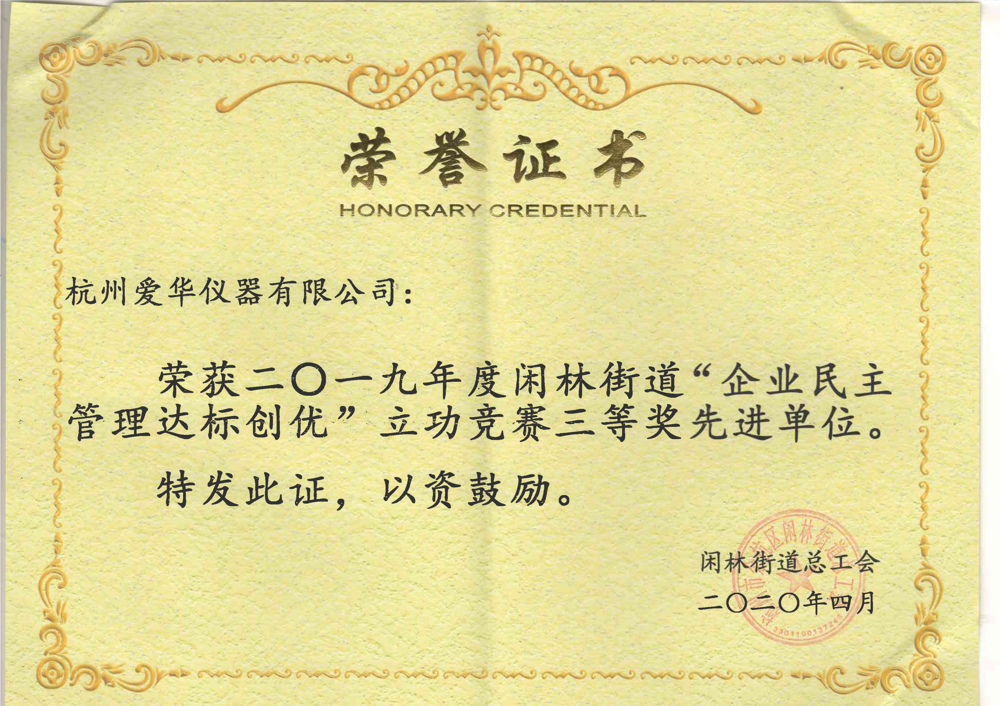 杭州重庆时时开彩官方网站-时时采彩计划软件-重庆时时开彩官网开奖查询-重庆时时开彩app下载-重庆时时采彩开奖号码走势图-老重庆时时开彩结果仪器有限公司工会获得2019年闲林街道基层工会工作考核结果一等奖及二零一九闲林街道“企业民主管理达标创优”立功竞赛三等奖;